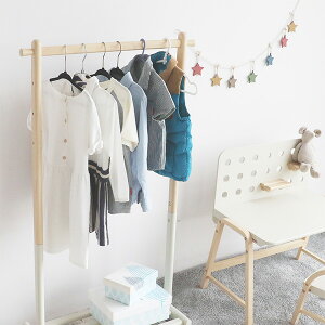 子ども用木製ハンガーラック。【キャスター付き・棚付き】園服も普段着の子供服も楽に掛けられる高さです。お子様の身の回りの物をたっぷりと収納できる大容量が魅力です。衣類や帽子、バッグはもちろん、玩具や文房具...