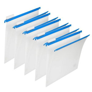 引き出しのフレーム等につるして書類を見やすく整理するハンガーフォルダー(引き出し整理用ファイル)。丈夫なPP製です。 規格:A4 5枚入 色:ブルー、本体色:透明 外形寸法:縦240x横311mm●厚さ:8mm●バーの長さ:344mm...