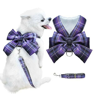 ABRRLO 犬 猫 ハーネス リード セット 蝶結び チェック柄 子犬用ハーネス 格子縞 中小型犬 抜けないハーネス Dリング付き メッシュ 可愛い 調整可(パープル 2L) 【魅力的な犬のハーネスリードセット...