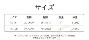 "仕様・サイズ (約)▼- S 胴回り24〜28cm 首回り20〜24cm 目安体重〜2.5kg以内- M 胴回り30〜36cm 首回り24〜28cm 目安体重2.5〜5.0kg- L 胴回り36〜44cm 首回り28〜32cm 目安...