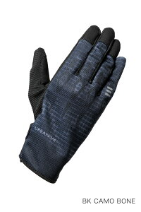 甲全体に施された グラフィックプリントが目を引く メッシュグローブ。 ナックルプロテクターを装備、 自然なフィット感で エントリーユーザーにもおすすめ。 スマートフォン操作も可能。