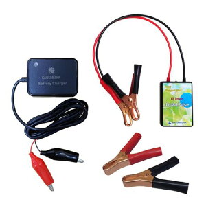 サルフェーション除去をおこなう【クリスタルパルサー】、バッテリーの維持充電用に【1Aバッテリー充電器】をセットにしました。クリスタルパルサーが一定の電圧まで下がると動作停止しますが、その後も自然放電で電圧低下が続きます
