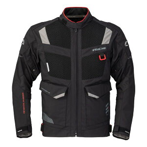 シュが優れた通気性を実現し、 真夏のライディングも快適にする、アドベンチャータイプのエアスルージャケット。 全方向からの視認性を高める、前後左右の反射材と肩・肘のCEレベル2プロ