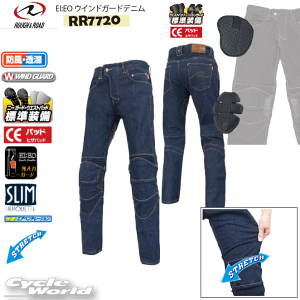 RR7720 EI:EO ウインドガードデニム 外入れニーガードでパッド着脱自由自在。 モード切替が可能なスリムストレートシルエット。。 ウインドガード仕様で、外気を遮断、体温低下を抑え ベンチレーションファスナーでエアーコントロール。