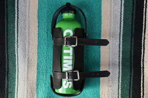サドルレザー製の携帯用燃料タンクホルダーです。1Lの容量で880ccほど入ります。アルミ製の燃料専用タンクにサドルレザー製のホルダーをつけ、フレーム等に簡単に固定できるようにしました。走行中タンクが飛び出さないように固定式のベ