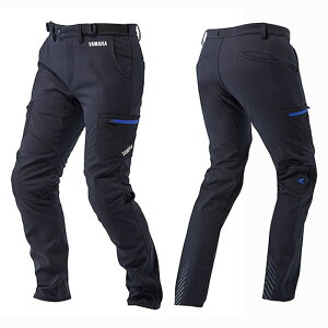 RY2001 ウインドストップソフトシェルパンツ 保温性を確保しながらも、やわらかい着心地でライディングフォームに追従する、 YAMAHAロゴとブルーの差し色を施した直履きタイプのライディングパンツ。 各所にプロテクターを内蔵 膝には高い