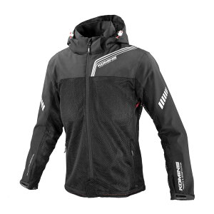 走行中に受ける風を効果的に取り込むカジュアルテイストのフルメッシュパーカ。インナープロテクターには通気性の高い薄型CEレベル1のソフトプロテクターを肩、肘、胸に、更に背中にはハニカム仕様のEVAパッドを装備。