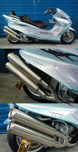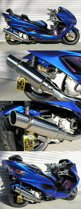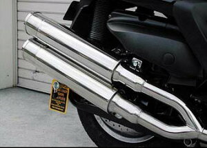 アトミックツインマフラーは、ビックスクーター界で主流になりはじめたサイレンサーを短くした、最先端のドレンドマフラーです。