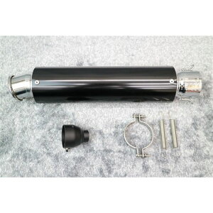 汎用スリップオンサイレンサー。差し込み径 50.8/45/42.7。アルミ製ブラックボディー。全長 約37cm。バッフル脱着可能。取付用サイレンサーバンドバネ付属。