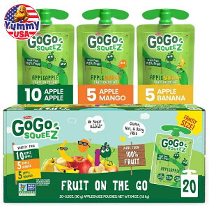 GoGo squeeZ Fruit on the Go の子供向けフルーツスナックは、高果糖コーンシロップ、着色料、香料、砂糖を一切使用していないフルーツから作られています*お子様に人気の 3.2 オンスのスナック パウチ 20 個パ...
