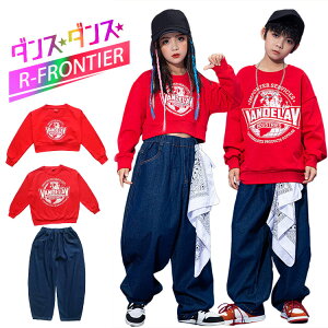 キッズダンス衣装 セットアップ デニムパンツ 長袖 へそ出し トップス 赤 HIPHOP ヒップホップ ステージ衣装 子供 練習着 韓国 ダンス発表会 韓国 110 120 130 140 150 160...