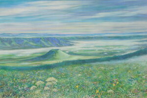 絵のサイズ: W71×H24cm ●額装サイズ:W98×H47cm ●絵画の技法:パステル画 ●サイン:作家直筆サイン 石井清先生がパステル画の絵画で描いた美しい熊本の阿蘇の絵「米塚と草原」は、早朝の初夏の阿