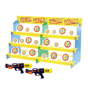 暑い季節にぴったりのスプラッシュ型イベントツール!床が濡れないビニールシート付き。 水鉄砲で的を狙い打て!倒した的の種類によって景品を変える等、使い方はアイデア次第。軽いプラスチックダンボール製なので女性でも簡単に組み