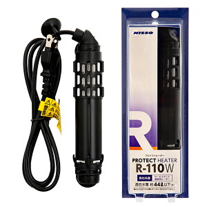 の安心設計!ニッソー プロテクトヒーター R−110W対象淡水・海水両用適合水量:約44L以下適合水槽:幅45cm以下特長●コンパクト設計の空焚き防止機能付きヒーターです。●コードを真上に出せ