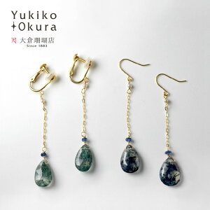 モスアゲイトの ロングチェーンイヤリング・ピアスです。 透明感のある石に描かれた模様が 深い森林を思わせるモスアゲイト。 1粒1粒異なる表情に天然素材の魅力を感じます。 チェーンとピアスフックには18金を使用。 イヤリング金具はネ