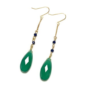 コバルトグリーンの色合いのグリーンオニキスを使用した、オシャレなロングピアスです。 鮮やかなグリーンオニキスに、ダークブルーのプチサファイアを2石デザインしていますので、非