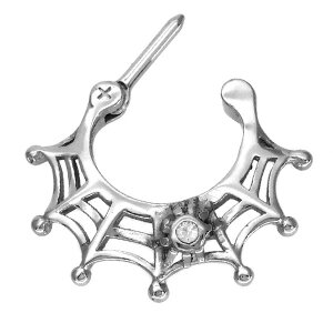 ワンタッチで簡単装着できるボディピアス クモの巣のデザインがかっこいいピアスはワンタッチで脱着できる簡単仕様。 シルバーのボディにクモの部分に付いたジュエルが光ります。 太さは耳たぶピアスにも軟骨ピアスにも使いやす
