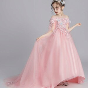 ウエディングドレスのような、ロングテールの豪華なキッズドレスです。刺繍とお花のモチーフが施された、大人っぽいオフショルダードレス。柔らかいピンクのカラーが女の子らしい、可愛らしいデザインです♪【カラー】ピンク【素材】
