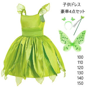 ティンカーベル ドレス 子供 ワンピース 女の子 妖精 コスプレ 衣装 お姫様 ピアノ 発表会 七五三 豪華4点セット ドレス お花の妖精 精霊 仮装 誕生日 プレゼント ギフト コスプレ コスチューム カラー...