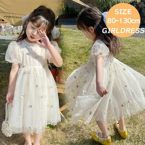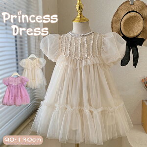商品名:チュールワンピース商品紹介:袖のレースパフスリーブが特徴的な子ども用ドレスです。胸元の刺繍レースでエレガントな印象になります。首元襟元のレース調の柄がエレガントさ上品さを演出、全体を丸いフォルムに見せるチュー
