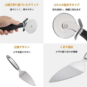 【2点セット】:回転式ピザカッターとナイフの2点セットで、あらゆるサイズのピザに対応します。ピザカッターのサイズは21.3cm×7.8cm、ピザサーバーのサイズは27.5cm×5.6cmです。 【食品...
