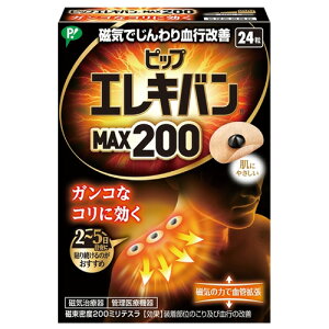 商品名ピップエレキバン200 内容量24粒 商品説明エレキバン史上最大磁力でガンコなコリに効く!磁気が体内に働きかけ、血行を改善して、老廃物を流し、コリをほぐす。におわず目立ちにくい。貼ったまま入浴できる薬剤を使わない治療...