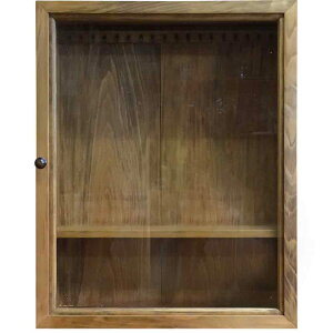 アンティークブラウンのカラーがレトロな雰囲気を引き出してくれる棚付きディスプレイケースです。 フック付きなので、ネックレスなどのディスプレイにもピッタリ。埃が気になる物も気軽に飾れます。 棚の奥行きも広めにとったので、