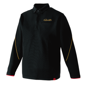 ・吸汗速乾性のニット生地を使用 。快適な着心地です 。 ・UVカットUPF50+。 ・フロントはスナップボタン仕様の比翼開き。 ・袖口にはカラーアクセントを取り入れ、Gamakatsuロゴプリントを随所に配置。 ・台襟付きのシャツ襟
