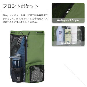 【乾湿分離ポケット】一つ小さいpvc防水ポケットがあり、携帯電話やカードや小銭なの貴重品が入れて汚す心配もいりません。 【大容量】十分なサイズなので、バス用品や水着や着替えやシューズなどをたっぷり入れられます。二つフロント