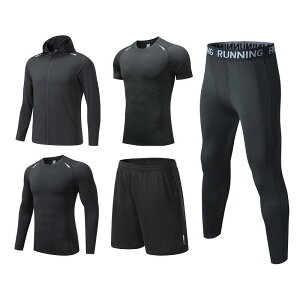 スポーツウェア メンズ 男性用 上下セット 5点セット ランニングウェア トレーニングウェア 速乾 伸縮性 通気性 吸湿性 サイクルウェア バスケットボールウェア レギンス ブラック 黒 グレー グレー...