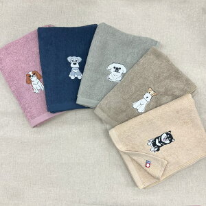 ワンポイントのイヌの刺繍が可愛らしいフェイスタオルです。 デイリー使いはもちろんプチギフトにもおススメです♪ 【サイズについて】 画像をご参照ください。 【カラーについて】 生産ロットにより柄の出方や色の濃淡が異なる場合が