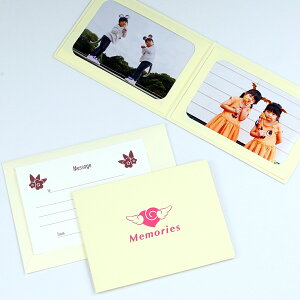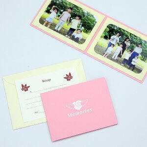 【基本仕様】 2Lサイズ収納、2ツ折2面(ヨコ・ヨコ) 【材質】 表紙:紙(タント紙/100kg両面合紙) ポケット:紙(タント紙/100kg) メッセージカード:紙(マーメイド紙/115kg)) 封筒:紙(ボ
