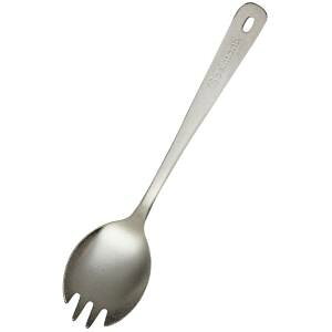 チタニウム製のフォークスプーン。素材:チタニウムサイズ:全長163mm重量:17g原産国:日本