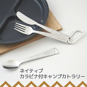 柄にネイティブ模様が装飾されたカトラリーセット。カラビナでひとつにまとめることができ、ザックやロープに吊り下げるなどキャンプシーンでも使いやすい。携帯しやすいため、野外活動に適します。お手入れのしやすいステンレス製。