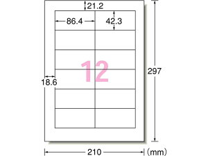 レーザープリンタでの印字適性に優れたラベルシールです。宛名用や表示用のラベルが手軽にキレイに作れます。【仕様】●仕様:12面ホワイト●面付:2列×6段●シートサイズ:A4(210×297mm)●1片のサイズ:86.4×42.3mm。