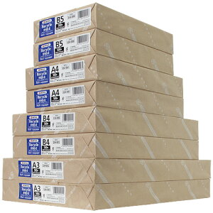 古紙パルプ100%ながら白色度80%仕様の再生紙、B5 500枚×5冊入です。外装箱はA式タイプ(観音開きタイプ)です。