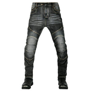 バイクジーンズ。超高強度・超高耐磨素材で、万が一の転倒時にもアスファルトからのスレをガードできます。両膝プロテクター付き、取り外し可能です。長年穿き古したような風合いを再現したジーンズ、バイク用のパンツにも日常の様々