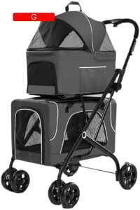 【多機能ペットストローラー】上層と下層に分かれたデザインは、異なるサイズのペットに対応可能。2匹の小型犬や猫の散歩に最適で、上部のコンパートメントはおもちゃや必需品を収納可能。