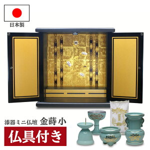 商品説明端正で風格ある質感の漆器ミニ仏壇“金蒔”。扉は上質感に包まれた漆黒の光沢塗り仕上げです。優美な内部の装飾はすべて蒔絵で作られており、スペ−スを広くお使いいただけます 商品名漆器ミニ仏壇 "金蒔(きんまき)"小タイ