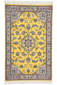 品名 ペルシャ絨毯 ナイン産 素材 ウール&シルク サイズ 約98cm x 160cm(フリンジを含まず) 生産地 ペルシャ ナイン 商品番号 59332 こちらの絨毯は、ペルシャのイスファハンの近く...