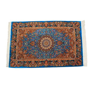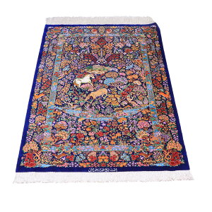品名 ペルシャ絨毯 素材 シルク サイズ 約52cm x 80cm(フリンジを含まず) 生産地 ペルシャ クム 商品番号 51520 ペルシャのクムで手織りのシルクペルシャ絨毯。 ベースカラーは深みのあるブルー...