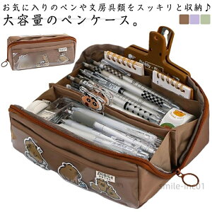 ペン類が約50本入る大容量デザイン。消しゴム、付箋、ハサミ、定規、メジャー、修正テープなどの小物もたっぷり収容できます。※容量はペンの種類によって異なる場合もございます。前のファスナーを開ければ、ペンホルダーが見開き式