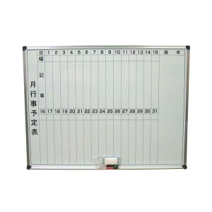 縦書き・月予定表入りの壁掛けホワイトボード。 こちらは幅1800mmのワイドサイズですので、豊富な記入スペースを活かした運用が可能です。 スケジュール管理のデジタル化が進んでいる昨今ですが、視覚的な伝わりやすさで言えば、このようなスケ...