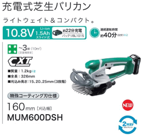 メーカー:Makita 商品名:充電式芝生バリカン【型式 MUM600DSH】 【特長】 ●手軽なコードレス ●特殊コーティング刃仕様 ●刈込幅160mm。3段階刈り込み高さ調整 ●連続運転時間 約40分 ●2ウェイチェンジ。生垣バリ...