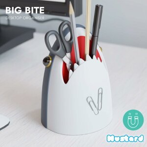 MUSTARD(マスタード) 商品詳細 サメにかみつかれたような、ユニークなデザインのペンスタンド。 おなかの中央にマグネットを内蔵しており、散らかりがちなクリップを浮かせてピタ
