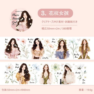 荷(土日祝を除く) 幅広50mm、ワイドタイプのクリアテープ 女の子と花柄、英字などのイラストがおしゃれ 耐水のPET素材、絶妙な透け感と色味が素敵! 水に濡れても破れないので、あらゆる所に使える 剥離紙付