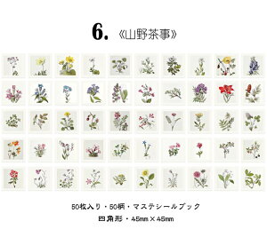 ◆平日16時迄のお支払いは当日出荷(土日祝を除く) 色んなフラワー、シダ植物、キノコのイラストシール マスキングテープ素材なのでほどよい透け感が素敵! 45mmの四角形のとてもかわいいミニマステシールブック 柄が全て異なる50枚が一冊
