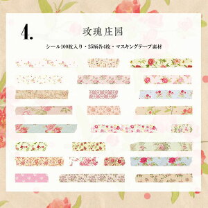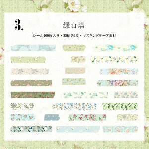 海外スティックシールセット たっぷり100枚入り、25柄各4枚 レトロ柄とくすみカラーが、おしゃれでかわいい マスキングテープ素材、程よい透け感が素敵! デコレーション、手帳、