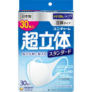 【商品詳細】「超立体マスク スタンダード ふつう 30枚入」は、三層構造フィルタと全面フィット構造でスキマを作らない立体マスクです。三層構造の高密度フィルタでウイルス飛沫・花粉をブロック。さらに超立体構造でぴったりフィット