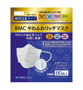 商品名BMCやわふわリッチマスク 内容量 80枚 商品詳細 特殊繊維使用で、肌触りアップ やわらか耳幅広ゴムで、快適なつけ心地 99%カットフィルター採用(PFE・BFE・VFE) サイズ /JAN ふつう...